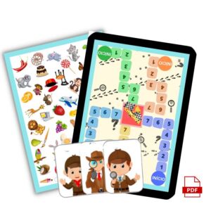 PDF com um (01) tabuleiro de figuras; um (01) tabuleiro de pontos (início/chegada); quatro (04) cartas de detetive; uma (01) carta de líder; vinte (20) cartas de pistas.