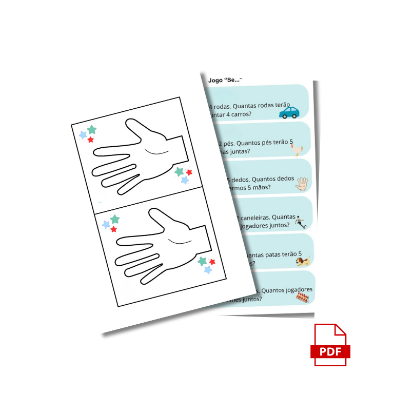 PDF com 6 cartinhas do jogo “Se…”, 12 cartinhas do jogo de raciocínio lógico, 1 prancha com a mãozinha